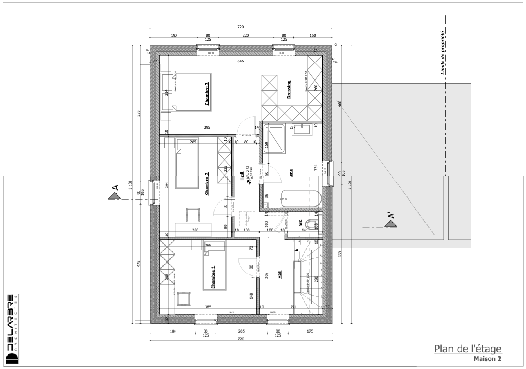 Composition étage : hall de nuit, WC, SDB, 3 chambres dont une avec dressing.
