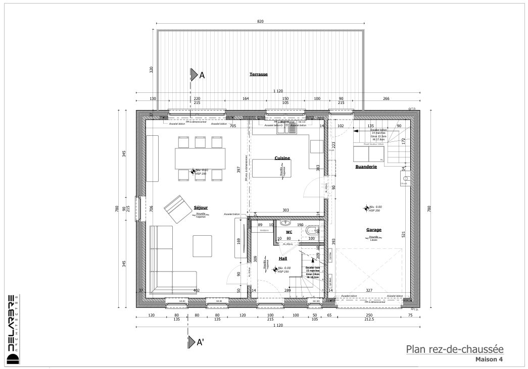 Composition RDC : hall d’entrée, WC, salon, séjour, cuisine et garage avec espace buanderie.