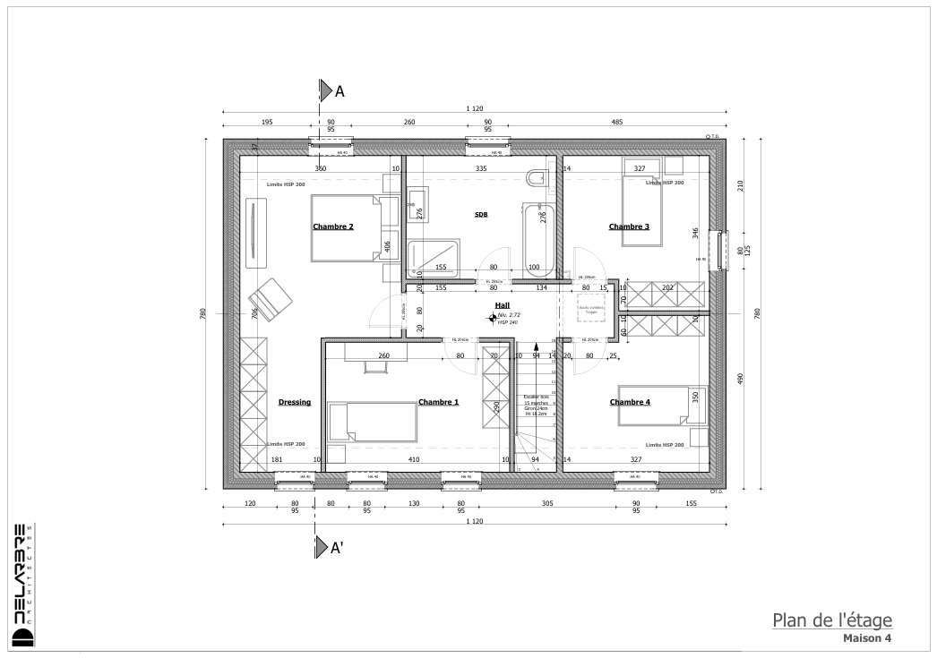 Composition étage : hall de nuit, SDB, 4 chambres dont une avec dressing.