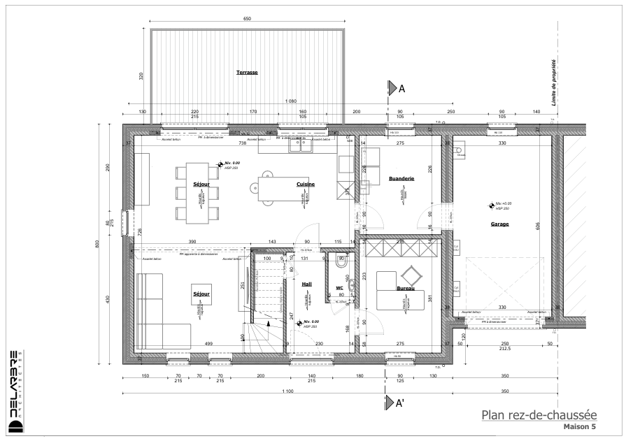 Composition RDC : hall d’entrée, WC, bureau/chambre, salon, séjour, cuisine, buanderie et garage.