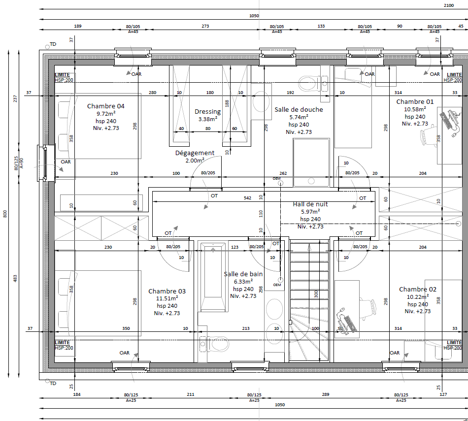 R+1 : hall de nuit, 4 chambres dont 1 avec dressing et salle de bain privative, deuxième salle de douche.