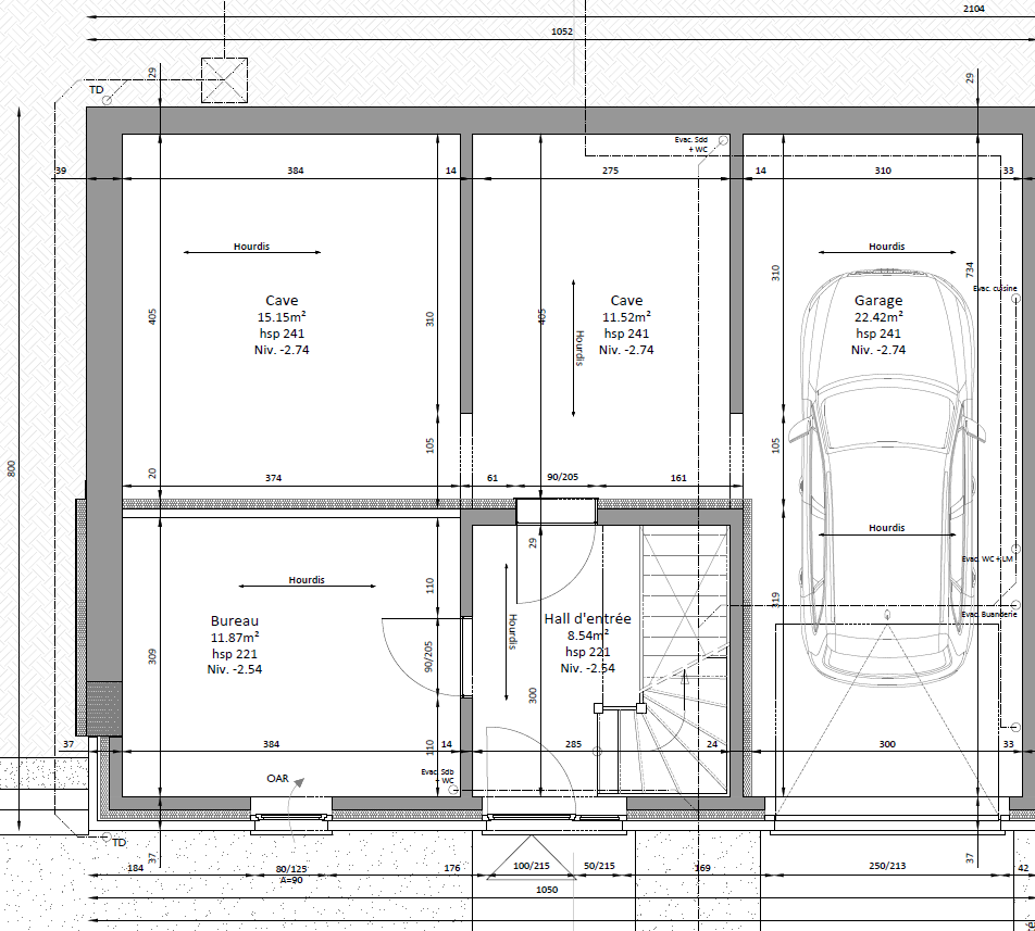Rez -1 : hall d’entrée, bureau, caves et garage.