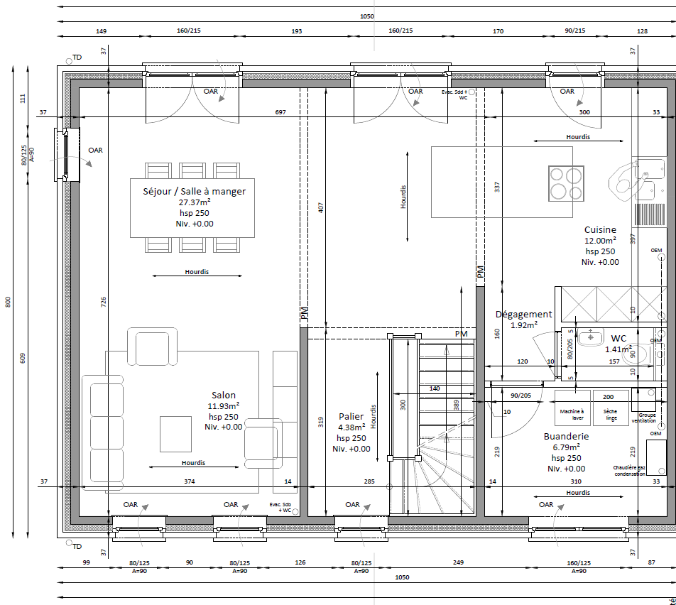 RDC : cuisine, séjour, salon, WC indépendant, buanderie, terrasse et jardin.
