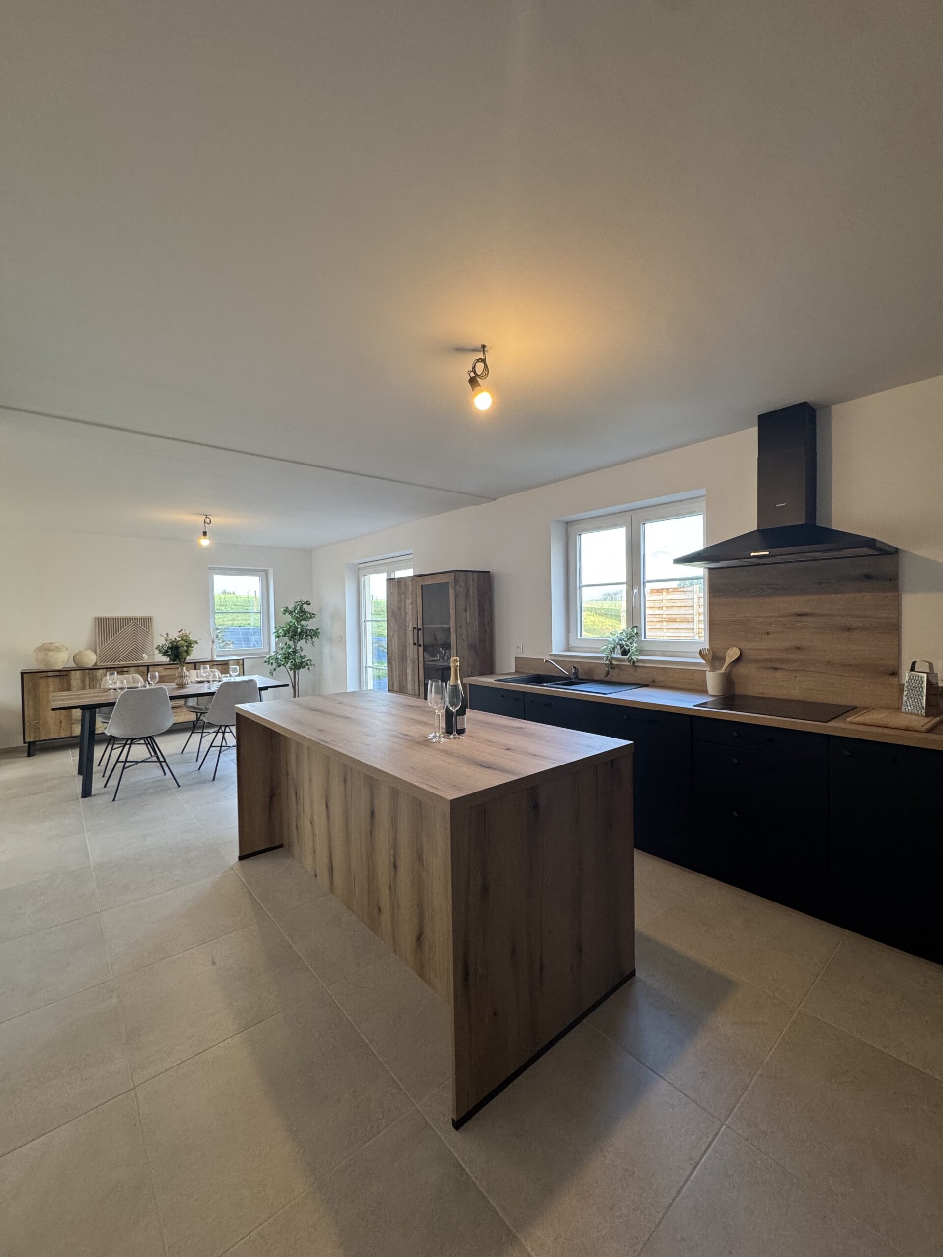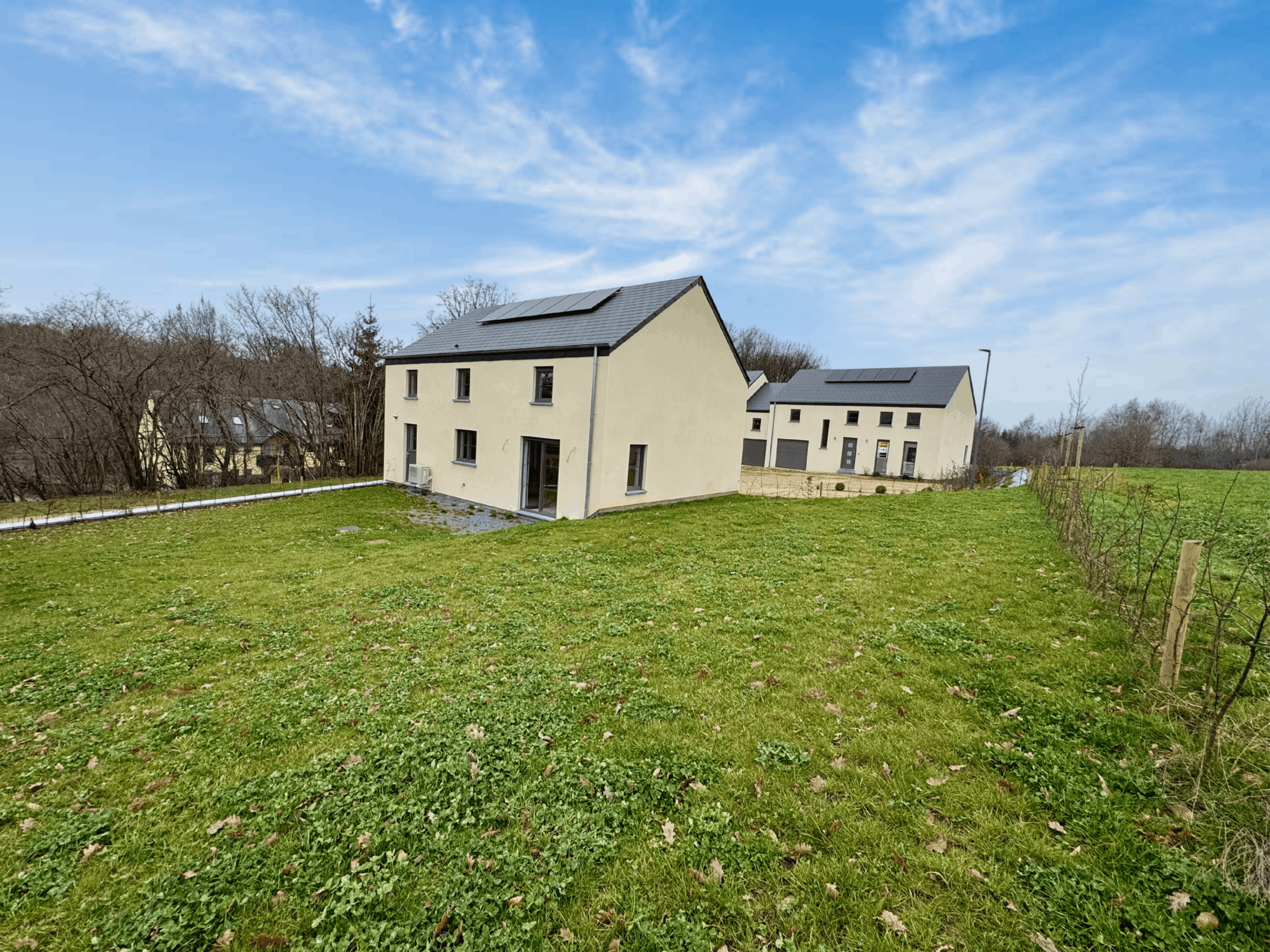 Eléments techniques : pompe à chaleur, chauffage sol, 10 panneaux photovoltaïques, citerne eau de pluie, cuisine équipée et sanitaires inclus.