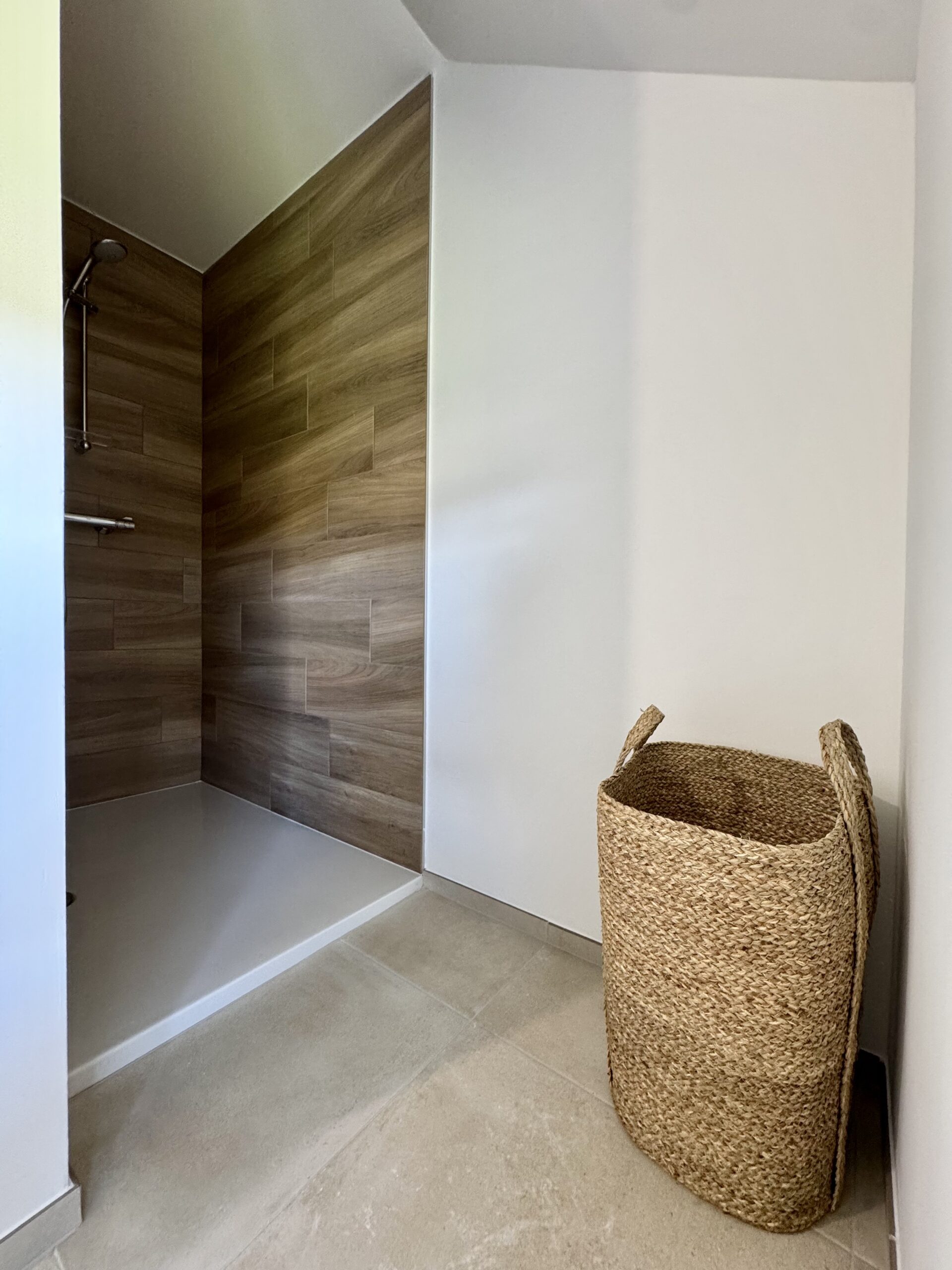 R + 1 : Hall de nuit, 4 chambres et salle de bain avec douche et baignoire.